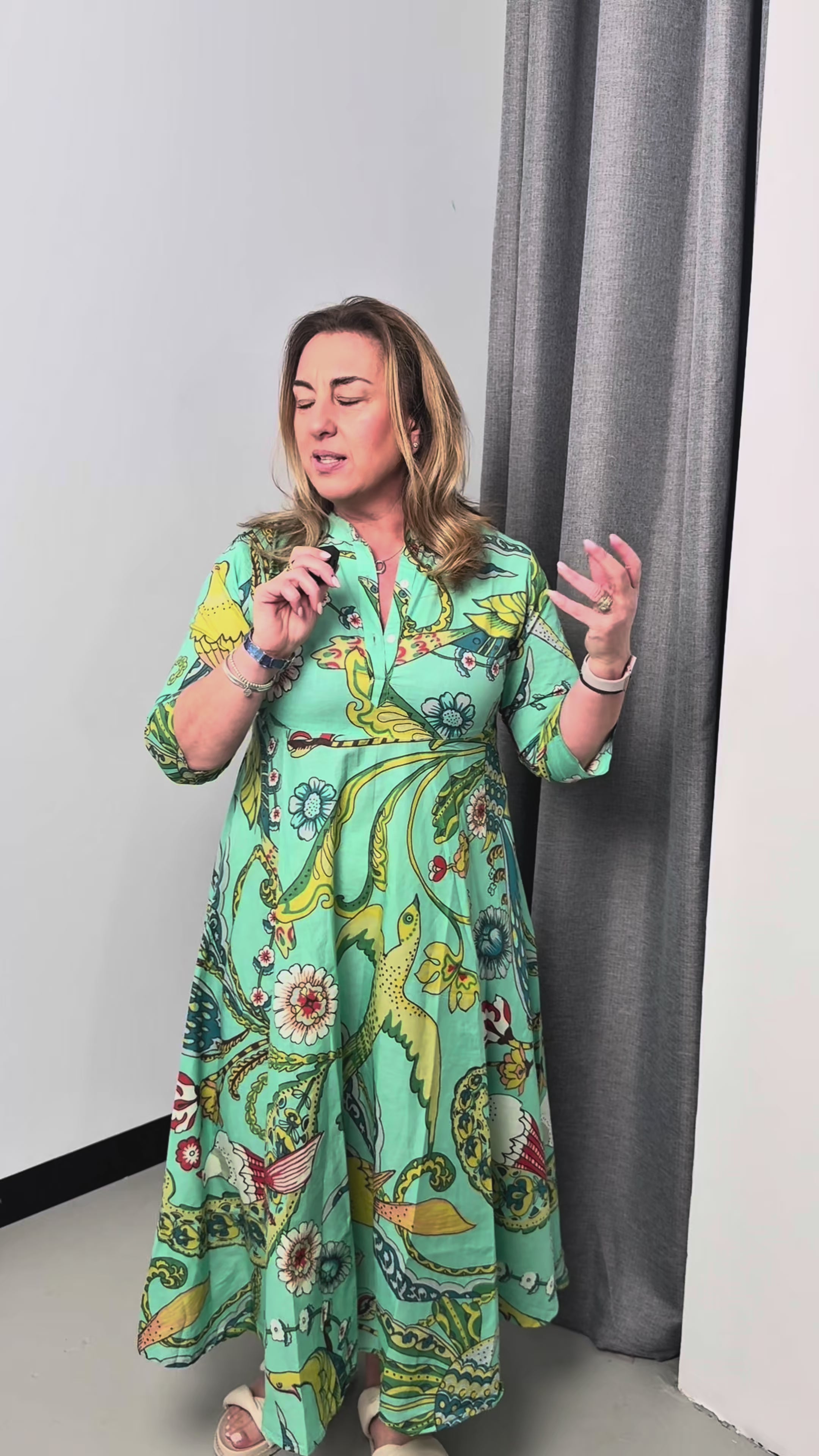 This dress is made 100% cotton. The fabric is screen printed by hand.